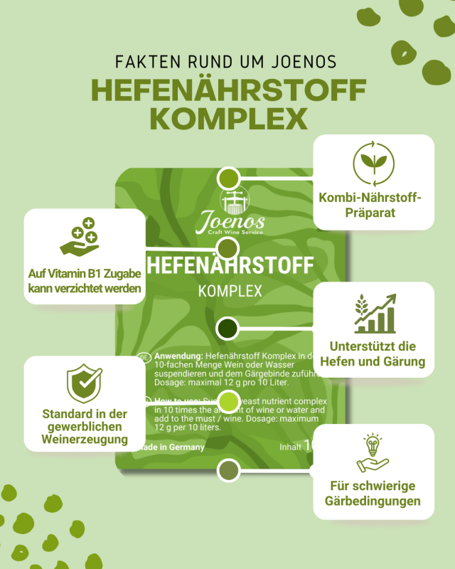 Dosierung: Hefenährstoff Komplex in der 10-fachen Menge Wein oder Wasser suspendieren und dem Gärgebinde zuführen. Dosage: maximal 12 g pro 10 Liter.